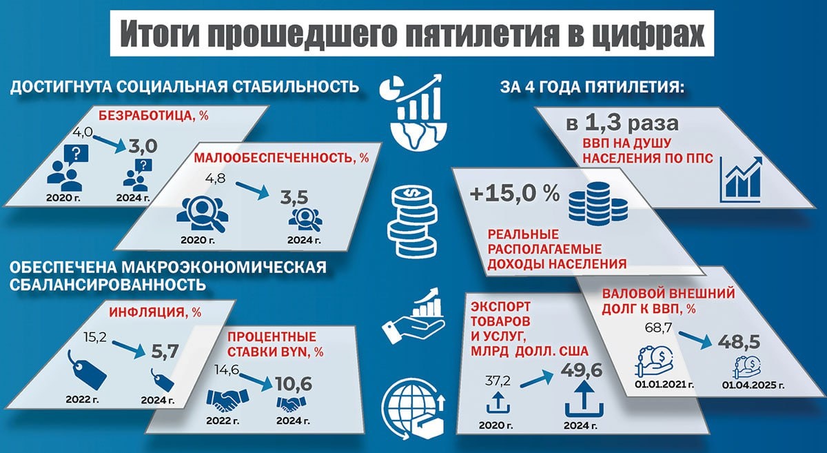 Главное достижение — повышение благосостояния граждан. ✅Достигнута поставленная задача по увеличению реальных располагаемых денежных доходов населения за пятилетие в 1,2 раза. ✅Реальная заработная плата выросла в 1,4 раза. ✅Уровень безработицы в республике значительно ниже, чем в ряде развитых стран, и устойчиво сокращается — до 3 процентов от численности рабочей силы в 2024 году Испания — 11,4 процента, Швеция — 8,4 процента, Канада — 6,4 процента. ✅Устойчивой остается динамика пенсионных выплат. Соотношение размеров средней пенсии по возрасту и средней заработной платы по экономике колеблется в диапазоне 36 — 37 процентов, что максимально приближено к мировому стандарту. ✅Сохраняется крайне низкий уровень малообеспеченности населения, который в 2024 году составил 3,5 процента по сравнению с 4,8 процента в 2020 году. ✅Благодаря проводимой социальной политике Беларусь сохранила свою позицию в группе стран с очень высоким уровнем человеческого развития, занимая ▪️ 65‑е место среди