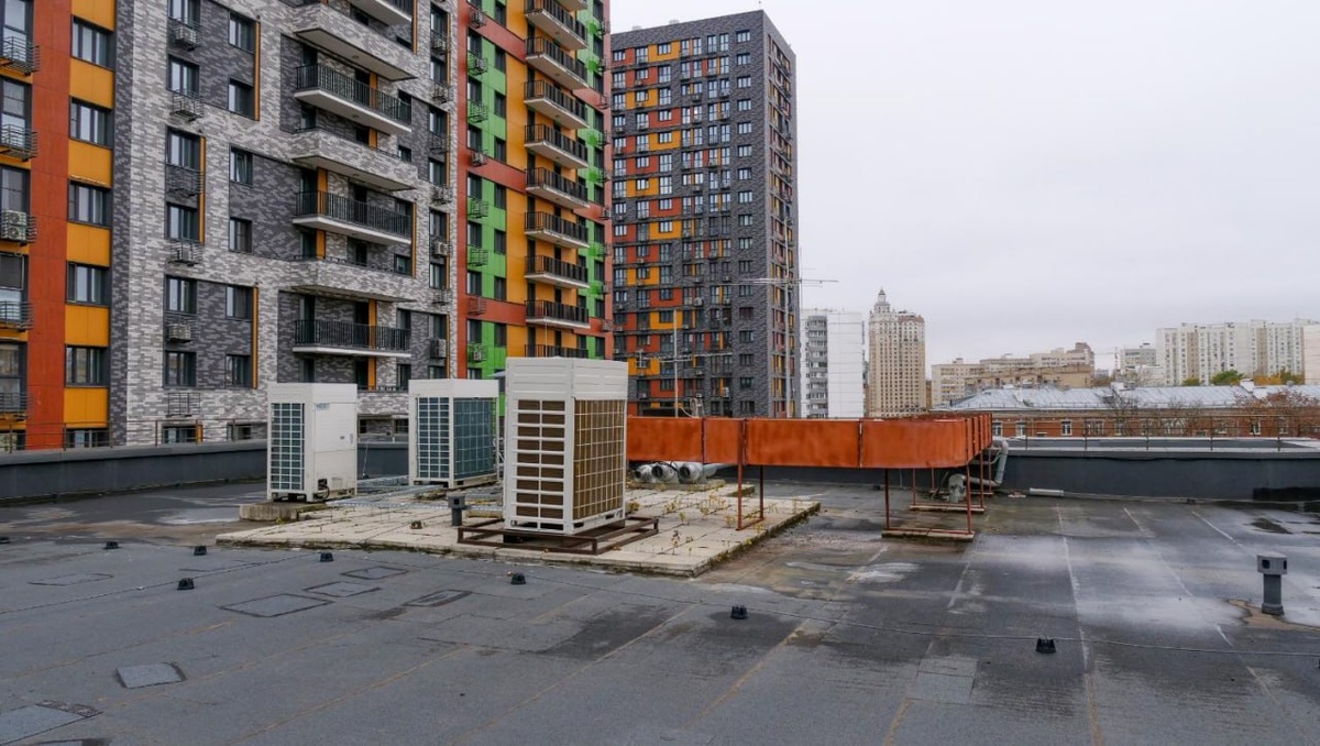 Мы установили VRF-систему. Установка мощного наружного блока, позволяет сделать разводку кондиционирования по многим помещениям. Перед запуском мы проверяли места соединений труб системы на возможную утечку. В систему закачивался азот и находился в системе под давлением для выявления возможных проблем. Когда всё было проверено, то в систему был заправлен хладагент "Фреон-410" и система заработала, подавая фреон в магистрали, подведённые к узлам распределения, а затем по блокам внутри помещений. Далее, было сделано водоотведение - отведение конденсата в канализацию. На крыше здания был установлен "домик" - приспособление закрывающее главный блок VRF-системы, позволяющее работать системе при минусовых температурах.