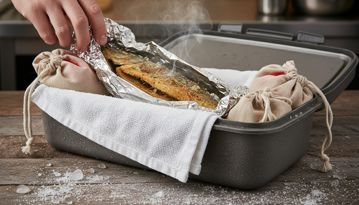 - Используйте 1–2 горячих грелки (бутылки с водой, нагретые до 80–90 °C и обёрнутые в ткань) по бокам, не в прямом контакте с рыбой. Горячие кирпичи в фольге тоже хороши.