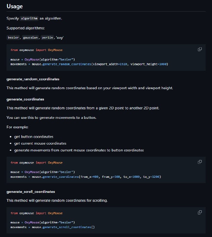 π± OxyMouse β ΡΡΠΎ Python-Π±ΠΈΠ±Π»ΠΈΠΎΡΠ΅ΠΊΠ° Π΄Π»Ρ Π³Π΅Π½Π΅ΡΠ°ΡΠΈΠΈ Π΄Π²ΠΈΠΆΠ΅Π½ΠΈΠΉ ΠΌΡΡΠΈ Ρ ΠΏΠΎΠΌΠΎΡΡΡ ΡΠ°Π·Π½ΡΡ Π°Π»Π³ΠΎΡΠΈΡΠΌΠΎΠ², ΠΏΠΎΠ·Π²ΠΎΠ»ΡΡΡΠ°Ρ ΡΠΎΠ·Π΄Π°Π²Π°ΡΡ ΡΠ΅Π°Π»ΠΈΡΡΠΈΡΠ½ΡΠ΅ ΡΡΠ°Π΅ΠΊΡΠΎΡΠΈΠΈ