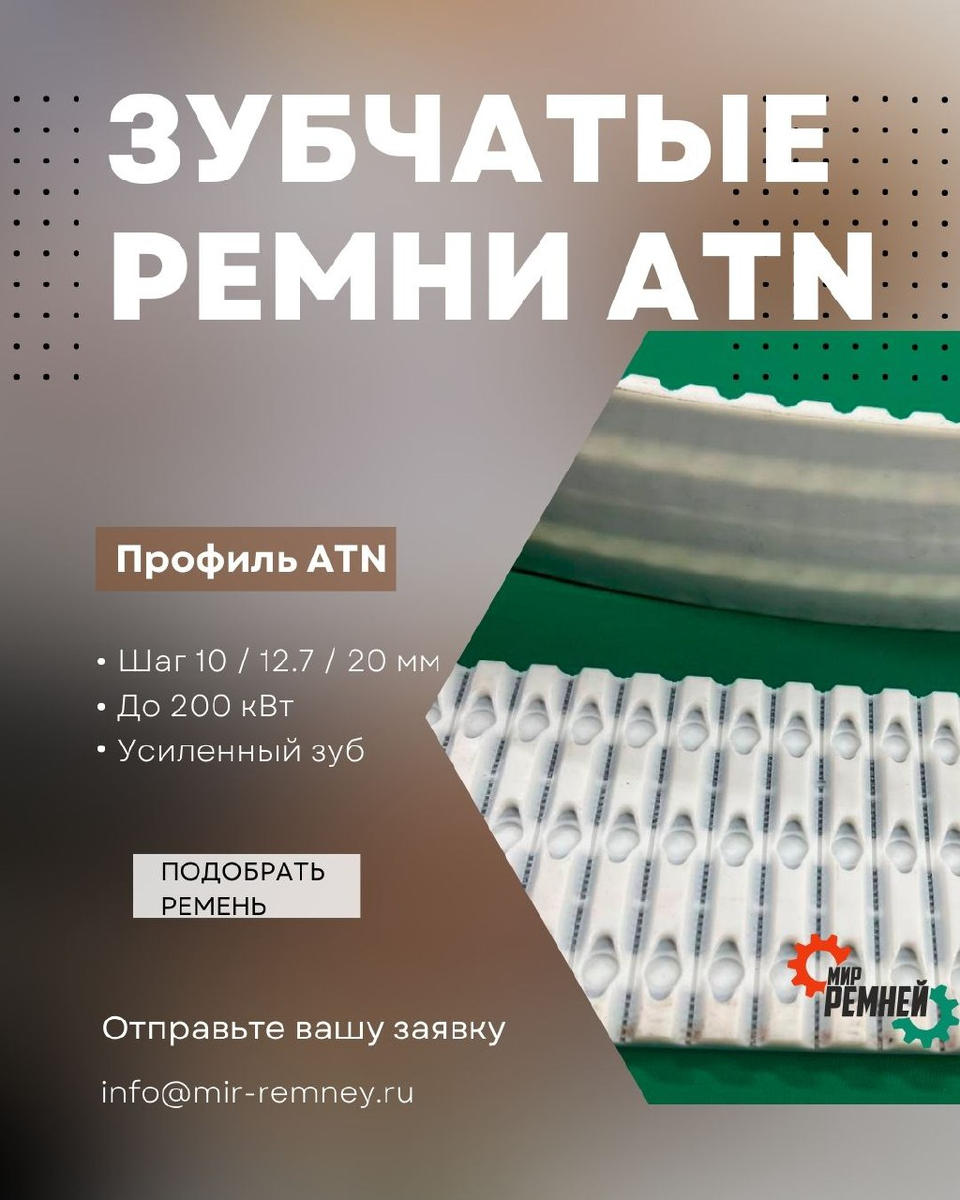 Зубчатые ремни профиля ATN — инновационная серия с шагом 10, 12.7, 20 мм, разработанная для высоких нагрузок и точной синхронизации. Специальный профиль зуба (усиленный AT) обеспечивает на 30–50 % большую передачу мощности по сравнению с классическим AT. 📌 Характеристики: • Шаг: ATN10, ATN12.7, ATN20 • Ширина: от 16 до 150 мм • Материал: полиуретан + стальной/кевларовый корд • Мощность: до 200 кВт (выше, чем у AT10/AT20) • Температура: –30…+100 °C • Скорость: до 60 м/с 🟢 Преимущества: • Увеличенная несущая способность зуба — меньше ремней в многоручьевом приводе • Минимальный люфт, высокая точность позиционирования • Сниженный шум и вибрации благодаря оптимизированному профилю • Долговечность — срок службы на 20–30 % выше стандартного AT • Совместимы со шкивами AT, но рекомендуются специальные ATN-шкивы 📦 Области применения: • Тяжёлые конвейеры и подъёмники • Упаковочные машины высокой производительности • Металлообрабатывающие станки • Робототехника и автоматизированные линии • Дер