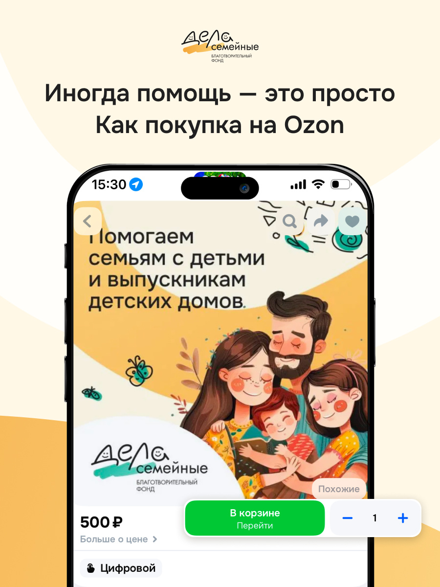 Поддержать семьи в трудной ситуации или выпускников детских домов можно так же легко, как заказать продукты или книгу. Мы напоминаем, что Благотворительный фонд «Дела семейные» подключен к программе Ozon Забота. Как это работает? Вы добавляете наш электронный сертификат в корзину вместе с обычными покупками. Вся сумма (без комиссий) идёт на помощь. Это безопасно и занимает минуту. Как найти сертификат? Несколько вариантов: Помогать можно на любую сумму — даже маленький взгляд меняет историю. Спасибо, что выбираете доброту!