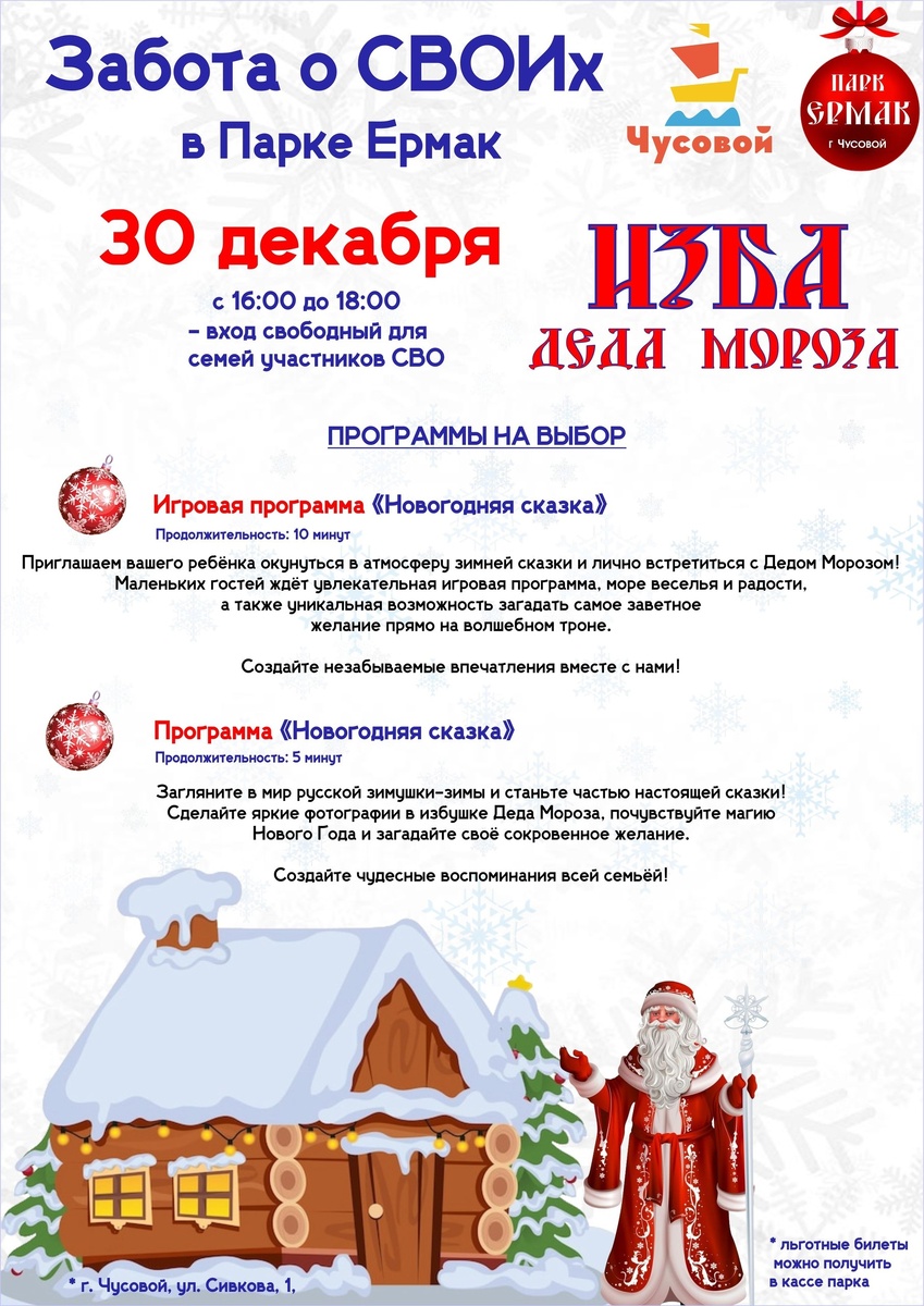 Вас ждёт незабываемое путешествие в мир сказки и чудес вместе с главным волшебником Нового Года. ✨ ❗ Получить пригласительный билет можно в кассе парка (в рабочие дни). Мероприятие, ранее назначенное на 24 декабря, переносится на 30 декабря из-за плохой погоды. #культура@glavachus #СВО_Чусовой@glavachus