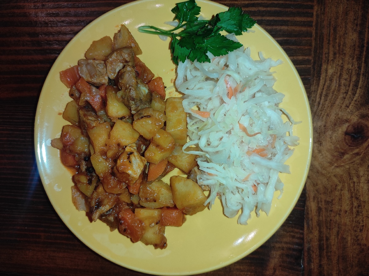 Один из таких рецептов — это картошка, тушеная в казане с мясом, «как из печи». Время приготовления: 2 часа с хвостиком (хвостик — это выключил духовку и можно подавать, а можно дальше продолжать встречать Новый год, а съесть — когда захочется). Ваше время — полчаса.
