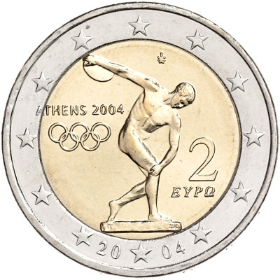 Первая юбилейная монета 2 евро, выпущенная Грецией в 2004 году в честь XVIII Олимпийский игр в Афинах. XXVIII летние Олимпийские игры прошли в греческих Афинах с 13 по 29 августа 2004 года. Игры XXVIII Олимпиады вновь вернулись на историческую родину — в Грецию, что придало им особое символическое значение. Девизом Игр стало «Welcome Home» («Добро пожаловать домой»), подчеркивавшее возвращение Олимпиады в Грецию. Официальная эмблема Игр изображала оливковую ветвь — символ мира, вплетенную в венок, выполненный в цветах греческого флага (белый и голубой). Ветвь также напоминала кисть руки, предлагающую миру оливковую ветвь — древний знак примирения. Талисманами Олимпиады стали два античных персонажа, созданных по мотивам древнегреческих глиняных кукол — Атлос и Февос. Их имена были взяты у двух братьев-близнецов из греческой мифологии, сыновей бога Аполлона, и символизировали связь между историей и современностью Олимпийских игр. На этих Играх была представлена новая медаль. Дизайн аверс