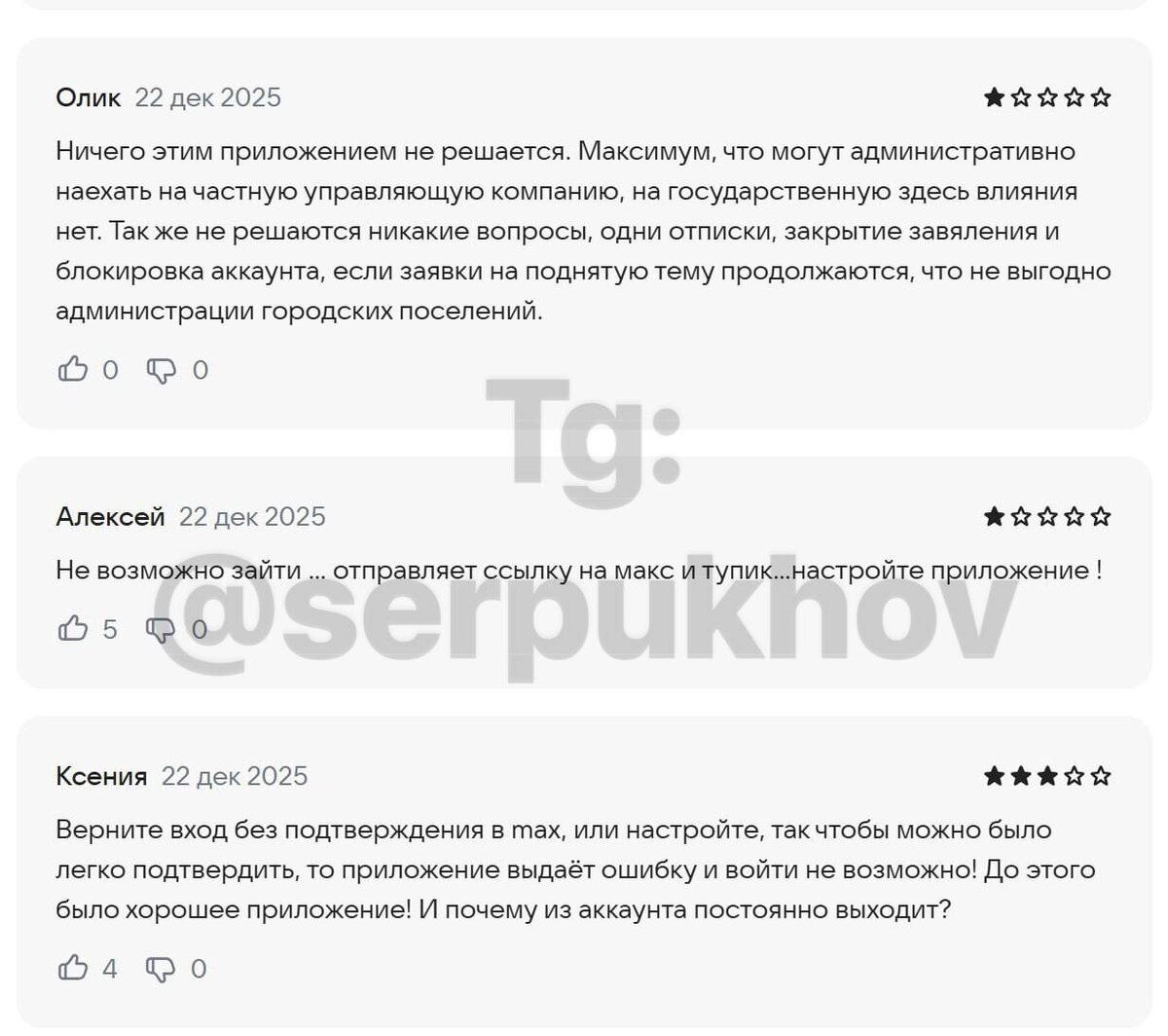 Жители Подмосковья не могут войти в приложение «Добродел»: авторизация идёт через Госуслуги, а те теперь требуют мессенджер Max. Проблема в том, что Max есть не у всех. А те, у кого он установлен, тоже войти не могут — система выдаёт ошибку. Люди не могут записаться к врачу, получить электронный рецепт, сообщить о проблемах ЖКХ. В RuStore — десятки негативных отзывов: «Задолбали без конца набирать пароль и логин, а теперь ещё и без Max не войдёшь. Хватит терроризировать пенсионеров. Я из-за вас таблетки купить не могу с электронного рецепта» «Невозможно авторизоваться. Авторизация только через Госуслуги, далее просит подключить Max, а дальше — не важно, есть у вас Max или нет — высвечивает ошибку» Рейтинг приложения обвалился до 3,3 балла. Пользователи предлагают писать о проблемах напрямую губернатору. ➡️ А вы пользуетесь «Доброделом»? Удалось войти после обновлений? @serpukhov