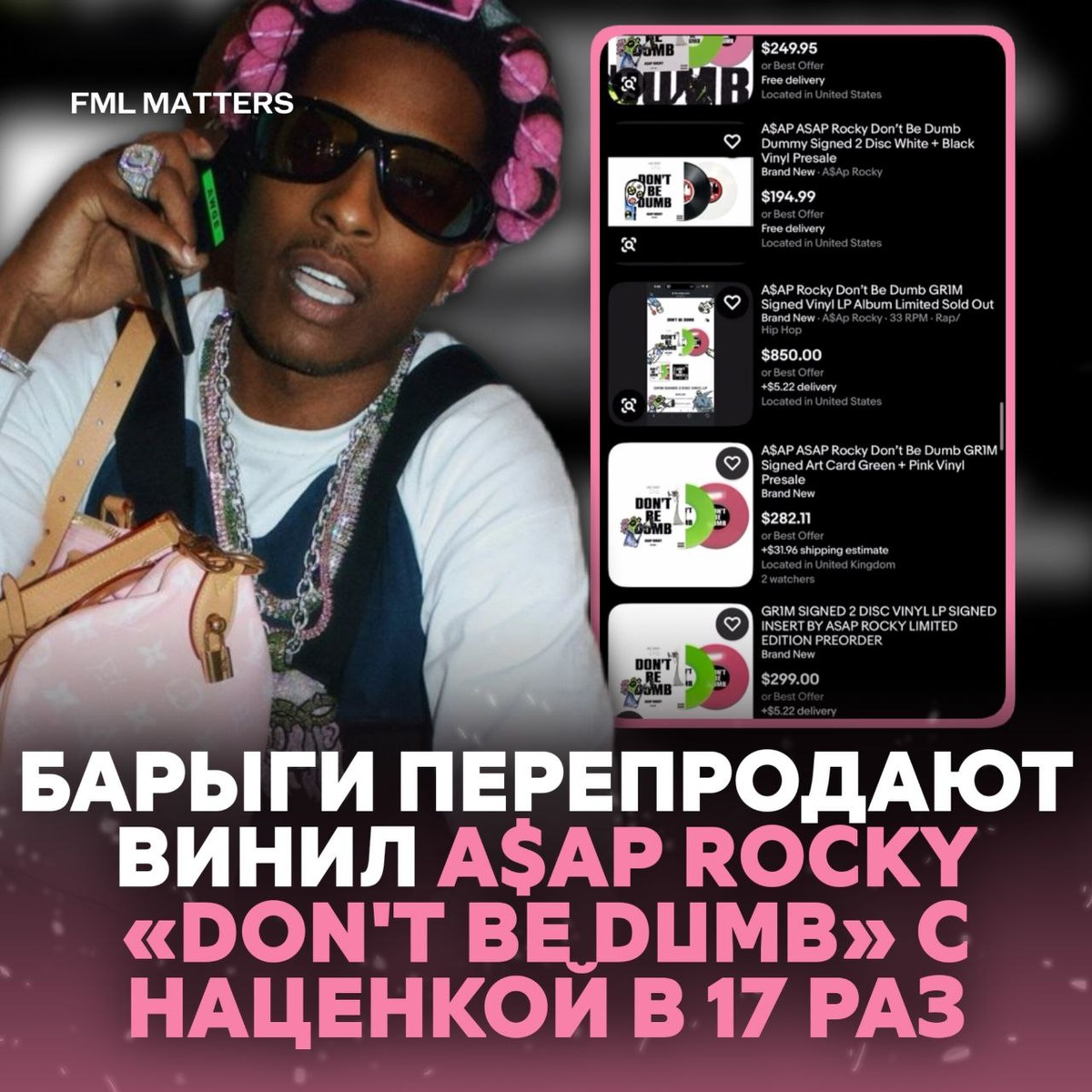 ! Этой ночью Рокки запустил продажу лимитированных подписанных виниловых изданий альбома «DON’T BE DUMB» в трёх вариантах: «GR1M», «MR. MAYERS» и «CRASHOUT DUMMY». Весь тираж был распродан за первые 30 минут при исходной цене около $50. Уже сейчас на местном авито, пластинки с подписью Рокки перепродают по цене от $194 до $850. Норм бизнес? ❤️🔥 / 👎 💀 FML MATTERS