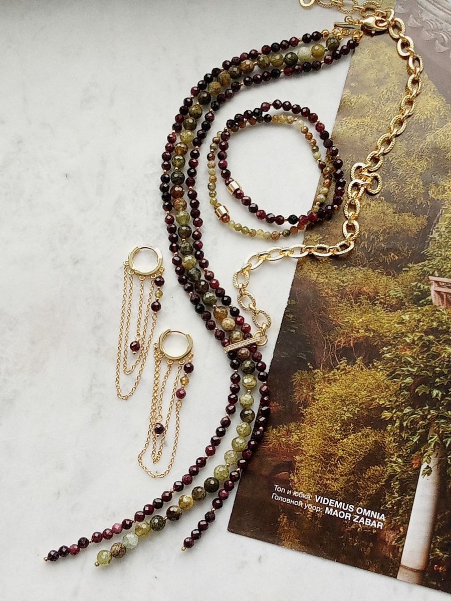 Комплект, в котором каждая деталь — результат внимательного диалога и любви к натуральным камням. Анна выбрала бордовый гранат и редкий зелёный гроссуляр— и получилось удивительное сочетание: тёплое и насыщенное, благородное и неожиданное. 🪽 Колье-галстук— асимметричное: с одной стороны — изящная золотая цепь, с другой — три параллельные нити граната, идущие рядом, подчёркивая объём и ритм. Длина регулируется за счет цепи 💫 Два браслета — тонкие, но выразительные. Идеально дополняют образ, не перегружая его. 💎 Серьги — лёгкие цепочки с аккуратными шариками граната. Они мягко движутся в такт вам — и всегда остаются в фокусе. Вся фурнитура — в тёплом золоте, подчёркивающем глубину камней, но не отвлекающем от их природной текстуры. 🌹 Это не просто украшения — это про вкус, про внимание к деталям и про уважение к тому, что создано природой. Как вам такой комплект? Готова создать что-то особенное и для вас 🤗 Пишите в WhatsApp ➡️ https://wa.me/79104151341 или в Telegram ➡️ @Ta