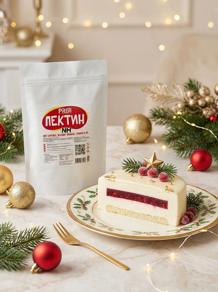 Обычный пектин требует сахара и высокой температуры для желирования. Не нужен сахар для желирования: Пектин NH желируется при контакте с ионами кальция (из сливок, молока или добавленного кальция), а не при высокой температуре. Это значит: вы можете готовить нежные фруктовые начинки, не переваривая их и сохраняя максимум свежего вкуса. Термостабильность: начинка на NH не потечет при нанесении горячей глазури, и её можно без опаски замораживать. Идеальный срез: получите плотную, но при этом нежную, тающую во рту текстуру, а не «резиновую» прослойку. Устойчивость к кислоте: в отличие от многих других загустителей, NH отлично работает в среднекислой среде (до pH 3.5). Это делает его идеальным для ягодных начинок (вишня, малина, цитрусы), которые часто используются в зимних тортах. Эффект “Маскировки”: в зеркальных глазурях NH создает очень мелкую и равномерную структуру геля, что максимально снижает вероятность появления пузырьков воздуха, которые могут испортить глянец. Ваши артикулы для