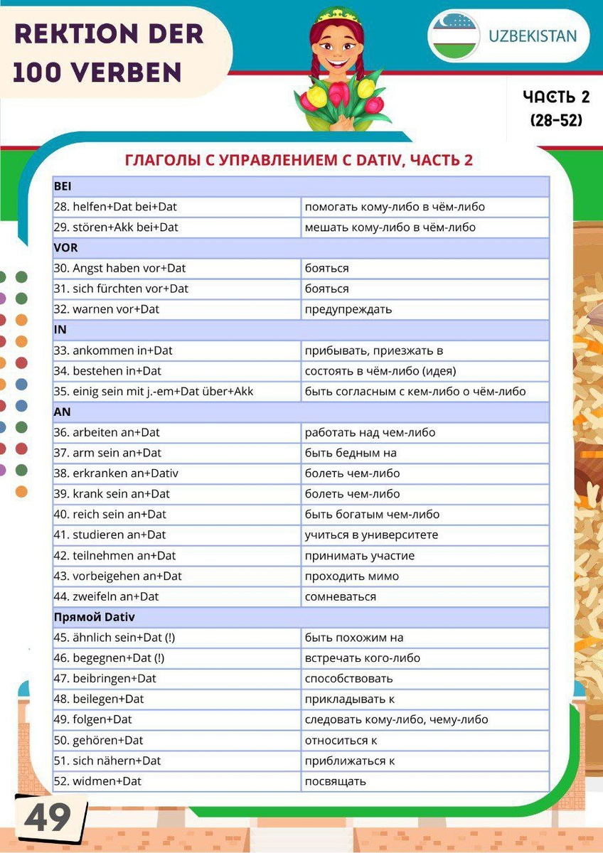 🇩🇪🇩🇪🇩🇪 Уроки немецкого языка со Львом Лучко: "немецкий без воды", управление немецкий глаголов с Dativ, часть 2. 🇩🇪 Rektionsverben mit Dativ. MIT. 1. beginnen mit+Dat 2. zufrieden sein mit+Dat NACH. 1. fragen nach+Dat 2. suchen nach+Dat 3. sich erkundigen bei+Dat nach+Dat AUS. 1. bestehen aus+Dat ZU. 1. gehören zu+Dat 2. sich verhalten zu+Dat VON. 1. abhängen von+Dat 2. träumen von+Dat BEI. 1. helfen+Dat bei+Dat VOR. 1. Angst haben vor+Dat 2. warnen vor+Dat IN. 1. ankommen in+Dat 2. bestehen in+Dat AN. 1. arbeiten an+Dat 2. studieren an+Dat 3. teilnehmen an+Dat Прямой Dativ. 1. ähnlich sein+Dat (!) 2. folgen+Dat 3. gehören+Dat 🇩🇪Лучко Лев, эксперт по немецкому языку, Ташкент, Узбекистан, клуб немецкого языка в @ecocafetashkent by @rafaelmirovich. #левлучко #репетиторнемецкого #видеокурсльвалучко #видеокурснемецкого #немецкийначинающих #немецкийснуля #немецкийбезводы #немецкийклуб #гётеинститут #startdeutscha1 #ташкент #узбекистан #левнасиба