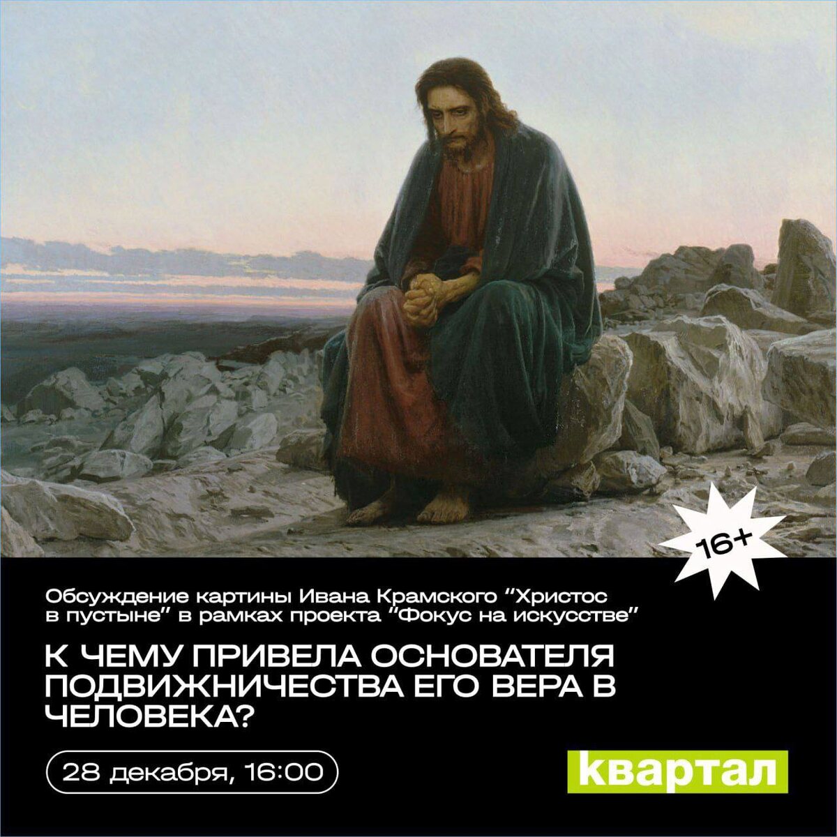 » 🗓️ 28 декабря, 16.00 📍Квартал, Ленина 78 Потрясшая жизнь художника и картина погрузит нас в размышления за горячим чаем. «Христос в пустыне» считается «этапным произведением Крамского и значительным явлением всей русской живописи». Художник рассматривает религиозный сюжет с гуманистической, морально-философской точки зрения и предлагает психологически-жизненную интерпретацию размышлений и переживаний Христа. 🏷️ вход свободный #28декабря25@culturnik