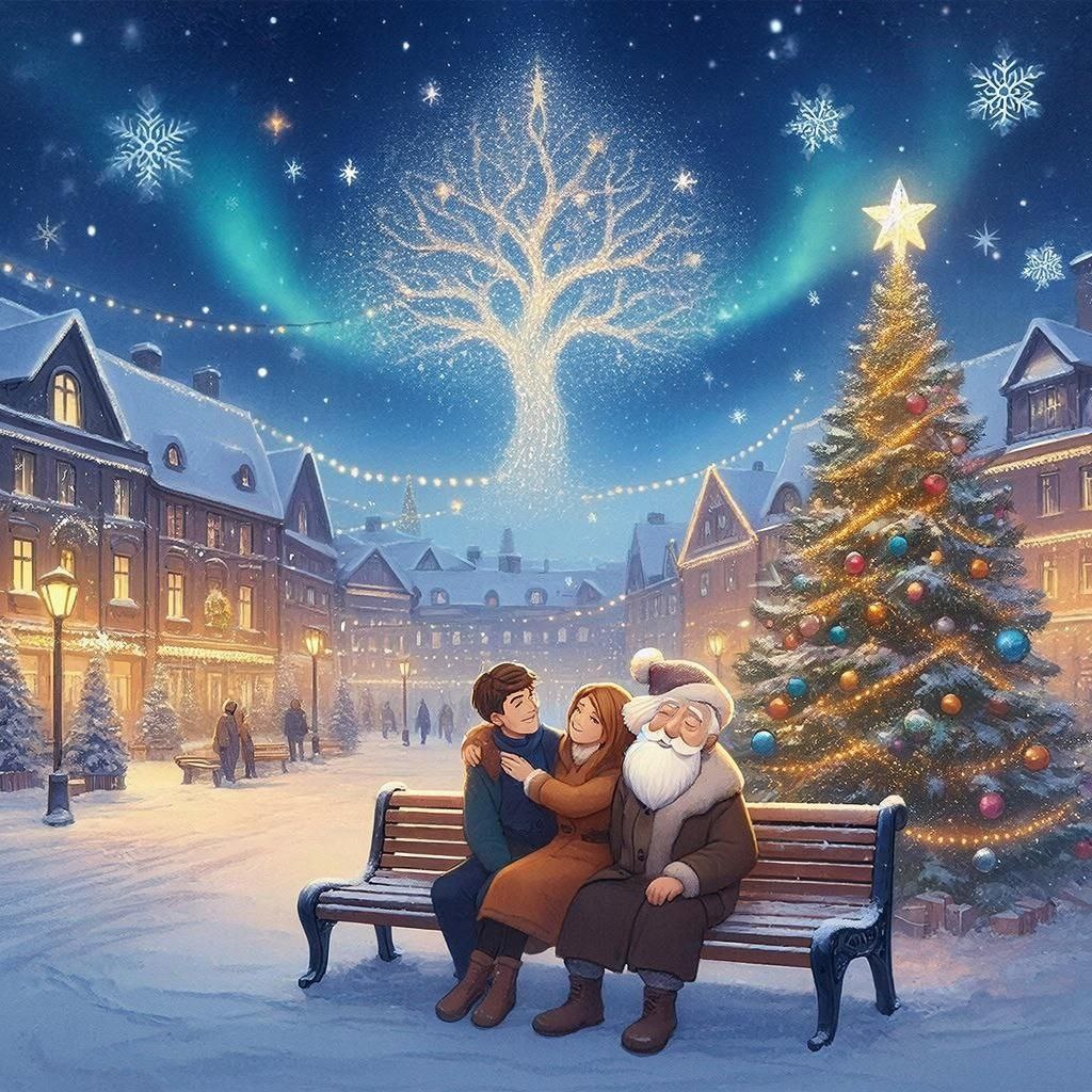 В одном небольшом городе, затерянном среди снежных просторов, жили-были мужчина по имени Алексей и женщина по имени Мария. Они были вместе уже несколько лет, но в последнее время их отношения стали напоминать зимний день — холодные и серые. Каждый из них чувствовал, что что-то не так, но не знал, как это исправить. Приближался Новый год, и в городе готовились к празднику. На центральной площади устанавливали огромную ёлку, украшенную яркими огнями и игрушками. Но для Алексея и Марии ёлка казалась лишь ещё одной напоминанием о том, что их жизнь потеряла радость. Однажды вечером, когда снег тихо падал за окном, Мария решила прогуляться по городу. Она остановилась у ёлки, которая сверкала огнями, и вдруг заметила, что под ней сидит старик с длинной белой бородой. Он улыбнулся и пригласил её присесть рядом. — Здравствуй, девушка. Почему ты такая грустная в этот волшебный вечер? — спросил он. — Я не знаю, как вернуть радость в свои отношения. Мы с Алексейем потерялись друг для друга, —