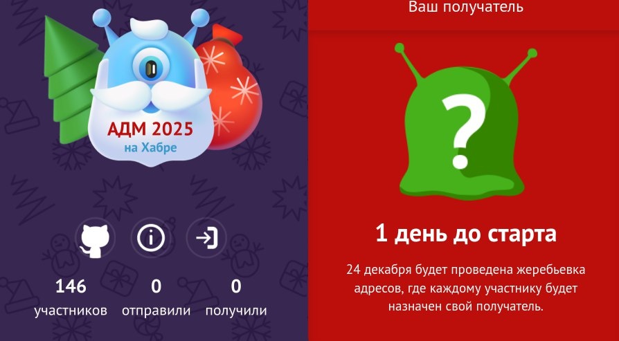 ⚡ Хабр напоминает: до старта жеребьёвки в новогоднем мероприятии Анонимный Дед Мороз 2025 остался 1 день