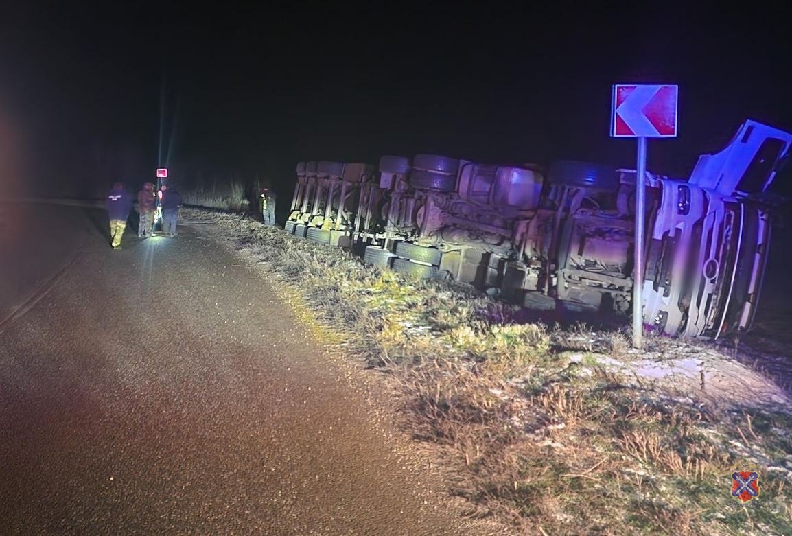 В Волгоградской области водитель фуры погиб после опрокидывания большегруза на обочине.