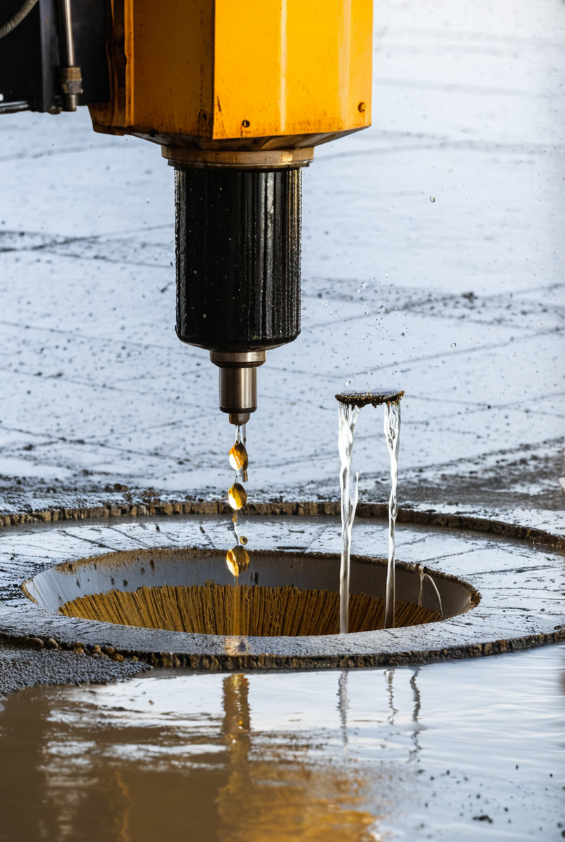 - Мокрое сверление. Идеально для железобетона. Постоянная подача воды обеспечивает охлаждение и вымывание шлама, что защищает алмазные сегменты от перегрева и ускоряет работу. Это промышленный метод, дающий высокую производительность.