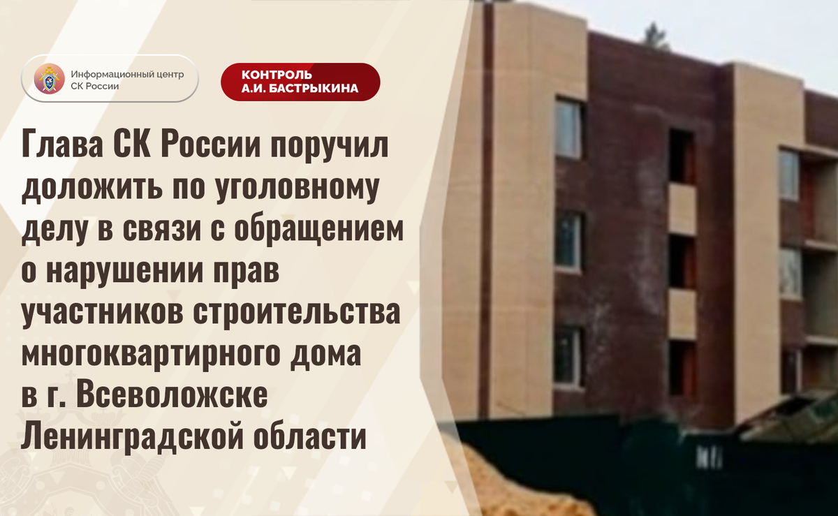 Глава СК России поручил доложить по уголовному делу в связи с обращением о нарушении прав участников строительства многоквартирного дома в г. Всеволожске Ленинградской области В комментариях социальной сети СК России «Вконтакте» размещено видеообращение по вопросу продолжающегося нарушения прав участников паевого строительства ЖСК «Всеволожский штиль» в городе Всеволожске Ленинградской области. С 2014 года граждане заключали с ООО ПМК «Всеволожскиндстрой» договоры на приобретение квартир в строящихся домах. Однако застройщиком взятые на себя обязательства исполнены не в полном объеме: в 2019 году несколько корпусов введены в эксплуатацию, при этом строительство оставшихся зданий до настоящего времени не завершено. Многочисленные обращения обманутых пайщиков в различные инстанции результатов не принесли. До настоящего времени никто к ответственности не привлечен, проблема не разрешена. Указанная ситуация освещалась в СМИ. Ранее А.И. Бастрыкин ставил ее на контроль в центральном аппарат