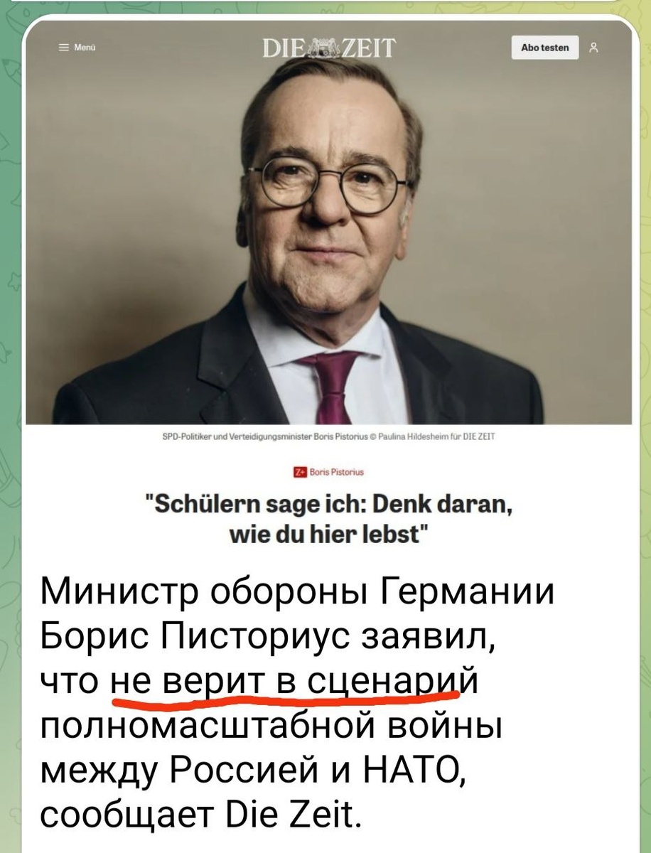 Что же поколебало веру министра обороны ФРГ Бориса Писториуса в скорую войну с Россией? Совсем недавно он в неё верил, а теперь перестал