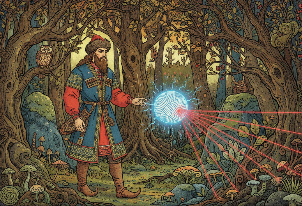 Типичная проблема редактора TechScanner: маршрут до работы построен, но ты в Шереметьево. И даже если вон оно, метро, ты всё ещё в Шереметьево. Невозможно оттуда вырваться! Вот бы надёжный навигатор, которому не нужны были бы вышки да спутники! Сегодня расскажем об устройстве магического помощника из сказки «Баба-яга», указывающего герою дорогу по лесам да горам. Он ведь и есть — навигатор с ИИ-маршрутизацией. Разберём на составляющие! В центре клубка, безусловно, компактный вычислительный модуль. Подобно чипам в мелкой электронике, он объединяет процессор, память и даже модуль связи. За распознавание волшебных слов («Катись к Бабе-яге!») отвечает nlp-модуль (Natural Language Processing — система, благодаря которой вы общаетесь с Яндекс Алисой). GPS-то нет — спутники над миром русских сказок не летают! Как тогда клубок понимает, где он? Всё просто. В его основе — не обычная хлопковая нить, а многослойное умное волокно. Отдельные его ворсинки улавливают спектральный состав света (опред