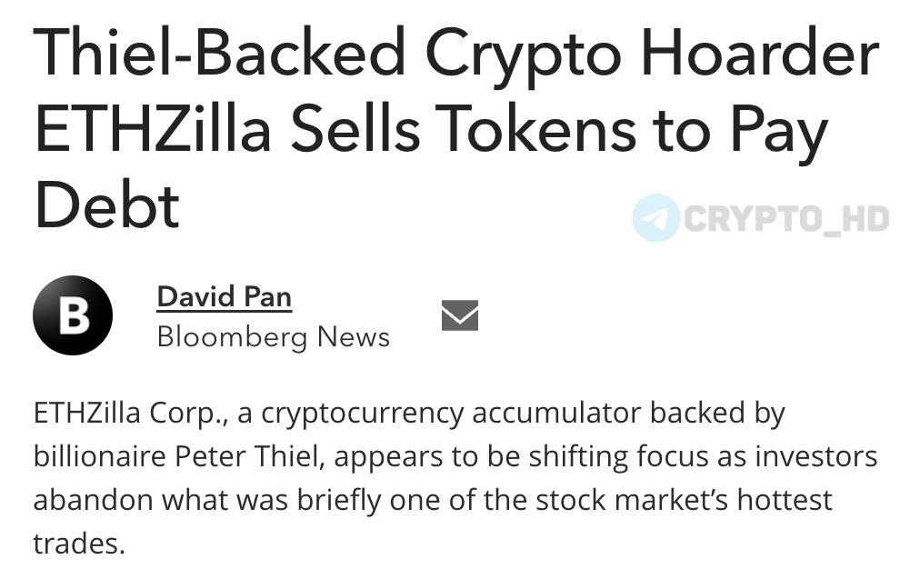 Компания, поддерживаемая Питером Тилем, продала 24,291 ETH ($74,5m), чтобы погасить долг. Что это значит: ▪️ ETHZilla фактически уходит от стратегии накопления ETH (DAT). ▪️ Фокус смещается на токенизацию реальных активов (RWA): автокредиты, недвижимость, авиационное оборудование. ▪️ ETH больше не ключевая метрика оценки. Теперь важны выручка и денежный поток. ▪️ ETHZilla даже закрывает публичный mNAV-дэшборд, снижая прозрачность для крипто-инвесторов. ➕ Напомним: компания планировала закупить ETH на $10b. Ранее: - продали ETH на $40m - провал крипто-казначейств Crypto Headlines
