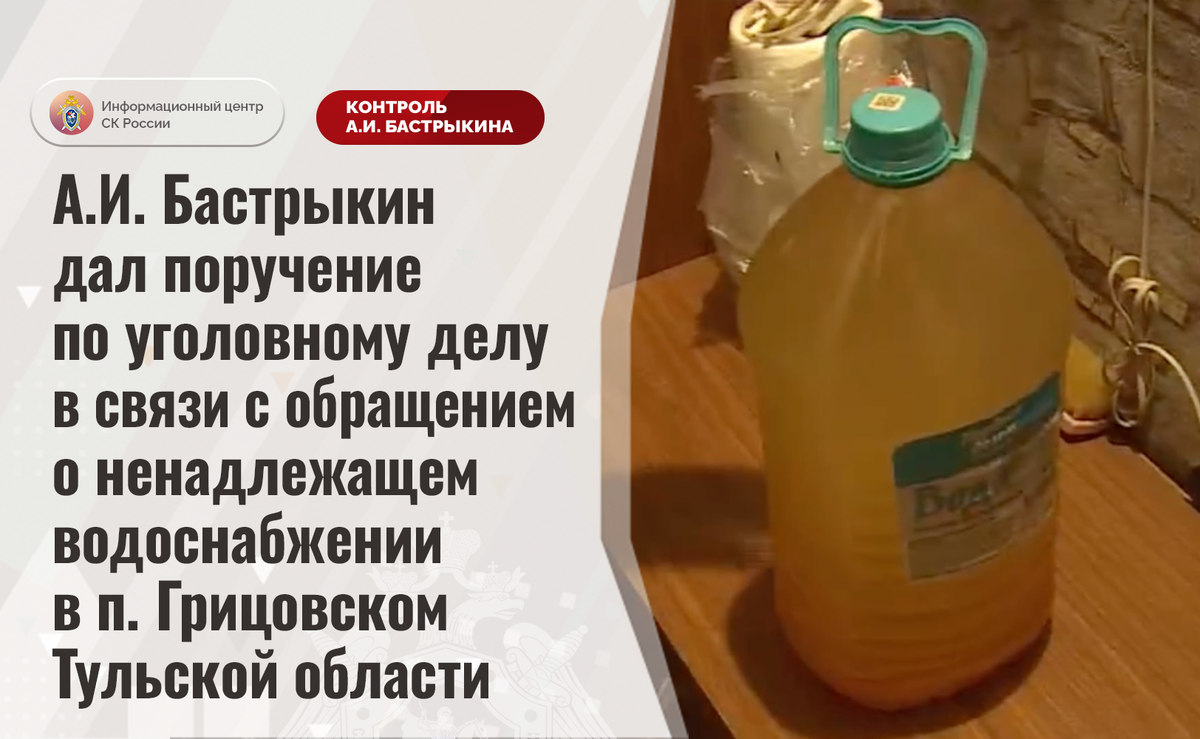 А.И. Бастрыкин дал поручение по уголовному делу в связи с обращением о ненадлежащем водоснабжении в п. Грицовском Тульской области В комментариях в аккаунте Информационного центра СК России в социальной сети «Вконтакте» поступило обращение жительницы Тульской области по вопросу несогласия с результатами установления обстоятельств ненадлежащего водоснабжения в поселке Грицовском. Из-за произошедшей в январе текущего года аварии на водозаборной станции в жилые помещения поступает жизненно необходимый коммунальный ресурс, непригодный для питья и бытовых нужд ввиду наличия примесей. Многочисленные обращения граждан в различные инстанции результатов не принесли. До настоящего времени проблема не разрешена, никто к ответственности не привлечен. Указанная ситуация освещалась в СМИ. А.И. Бастрыкин ставил ее на контроль в центральном аппарате ведомства. В СУ СК России по Тульской области расследовалось уголовное дело, которое прекращено. Председатель Следственного комитета Российской Федерации