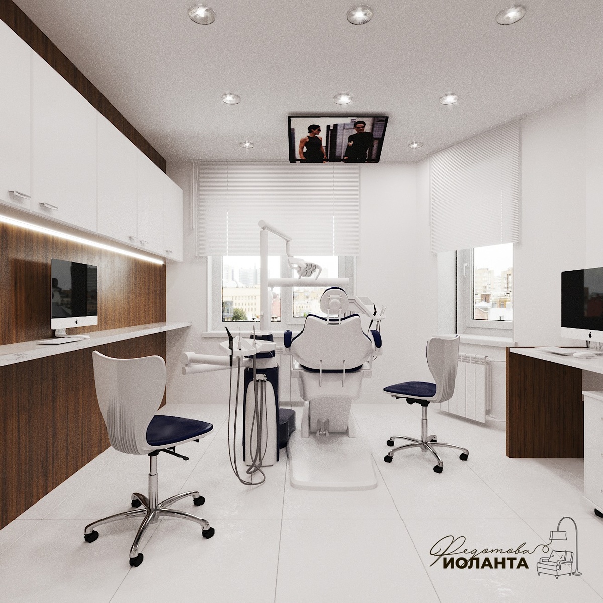 Когда мы проектировали стоматологию «Культура улыбки», у каждого кабинета была своя история. Например, Кабинет №1 — терапевтический. Изначально мы решили разделить его на две части: в основной зоне должен был работать врач-терапевт, а в закутке — разместиться кабинетик для гигиениста. На чертежах всё выглядело аккуратно: компактно, рационально, функционально. Но на практике оказалось, что такое решение слишком тесное. Пространство, которое задумывалось для гигиениста, оказалось неудобным и с точки зрения эргономики, и по ощущениям. В стоматологии важен каждый метр — он должен давать чувство воздуха, а не замкнутости. Поэтому мы пересмотрели концепцию. Сегодня этот кабинет работает как полноценный терапевтический, а небольшая зона, которую планировали отдать под гигиениста, используется иначе: здесь пациент может спокойно побыть до или после процедуры, отдохнуть, подождать пока пройдёт действие анестезии. Это оказалось куда полезнее для клиники и пациентов, чем изначальная идея. Визуаль