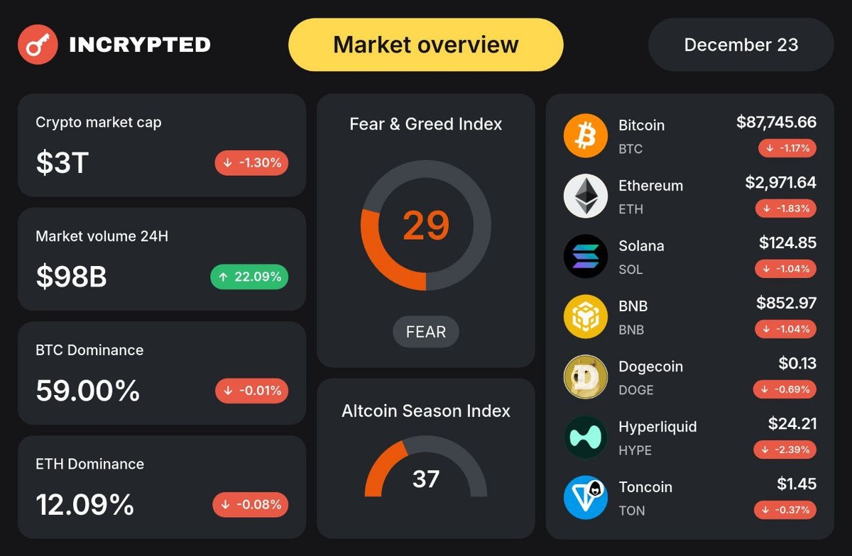 - BTC ≈$87 700 (-1.17%) - ETH ≈$2 970 (-1.83%) - SOL ≈$125 (-1.04%) - Капитализация рынка ≈$3T (-1.30%) - Индекс страха и жадности: 29 (страх) - Индекс альтсезона: 37 Детальнее в инфографике.