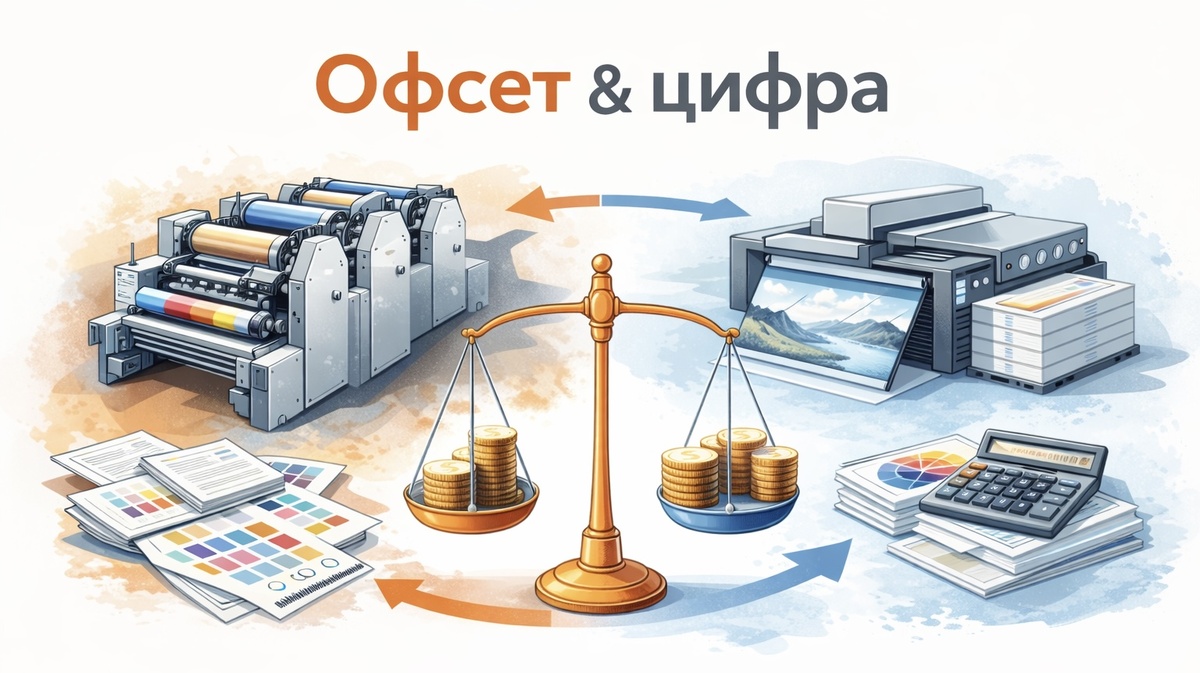 Если вы хоть раз заказывали печать буклетов, календарей, каталогов или любой рекламной полиграфии, вы точно слышали два слова: цифра и офсет. Кажется, что разницы почти нет — «лишь бы напечатали». Но итоговая цена и качество могут отличаться в разы. Разбираем по-простому: какую технологию выбрать при тираже 50, 500 и 5000 экземпляров. Тираж 50 шт: здесь всегда побеждает цифра Маленькие тиражи — это территория цифровой печати. Почему? • запускается сразу «с файла», • нет затрат на формы, • быстро, • недорого. Офсет на таком тираже — переплата без смысла: подготовка занимает больше, чем сама печать. Вывод: до 200–300 экземпляров — почти всегда цифровая печать. Тираж 500 шт: точка, где цифра становится дорогой, а офсет — выгодным Вот здесь самое интересное. Многие по инерции идут в цифровую печать, но на 500 экземплярах начинается «магия офсета»: • стоимость за штуку резко падает, • цвет становится стабильнее, • доступны все типы отделки (ламинат, УФ-лак, тиснение). Цифра же работает по п