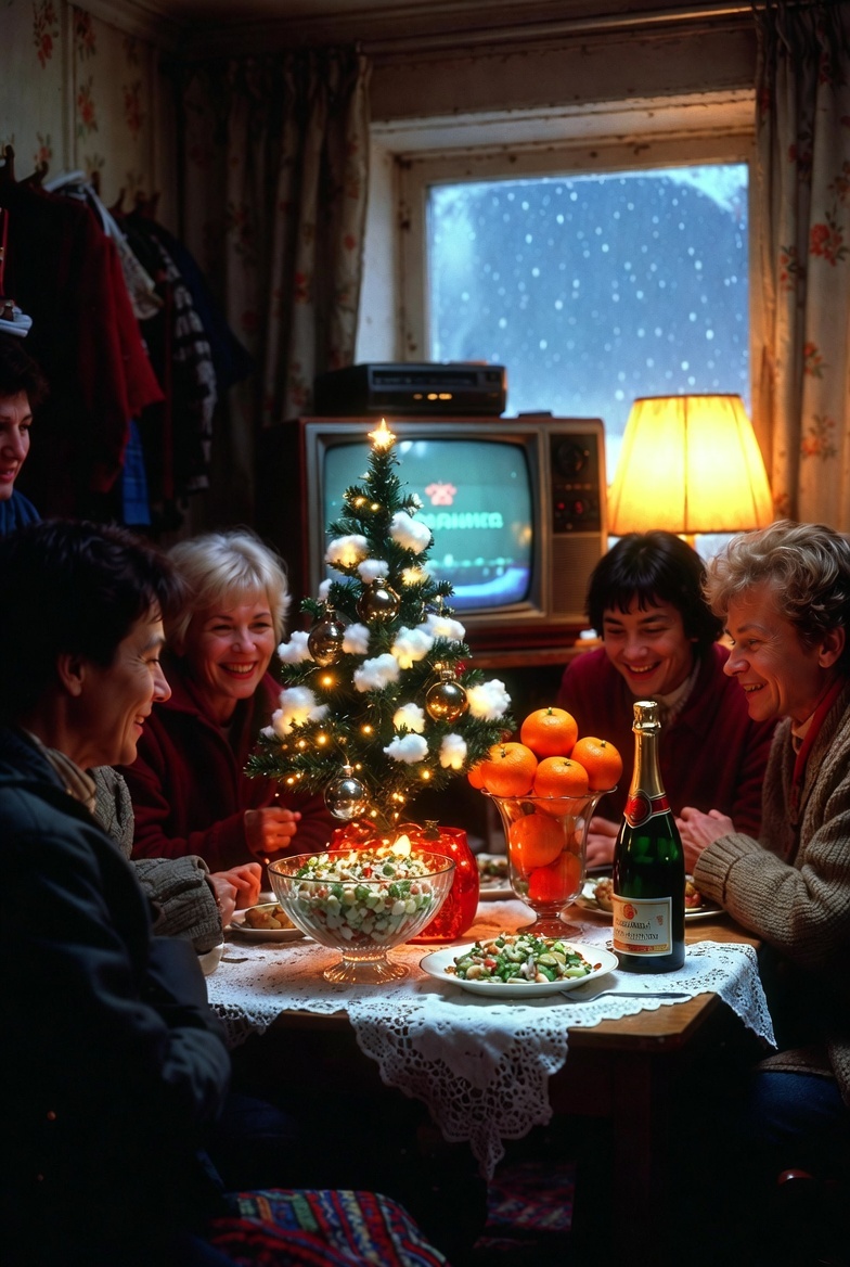 Телевизор включали заранее – один канал, "Огонёк" с Пугачёвой, Киркоровым молодым, шутками. Все за столом, куранты бьют, президент говорит (тогда Ельцин), бой бокалов, пожелания. Потом танцы под магнитофон – кассеты с "Ласковым маем" или "Миражом". Дети (мои тогда маленькие) бенгальские огни жгут на балконе, фейерверков не было – дорого, но салют из окна смотрели. А в 1999-м – вообще страх, все про конец света шептались, но встретили – и ничего, живы.