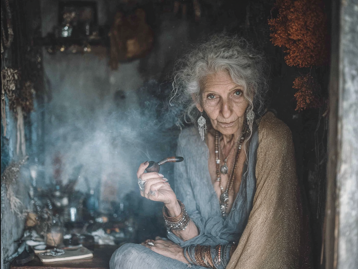 Минздрав России предупреждает: курение вредит Вашему здоровью! Эксперимент проведен влиянием песни "Моя бабушка курит трубку" Гарика Сукачева. Еще с юных лет я присматривалась к пожилым и старым женщинам, чтобы увидеть интересную для меня ролевую модель на будущее. Но чаще мне виделись испуганные постаревшие девочки. Эта тема будет еще часто у меня всплывать. Но сейчас про смелый и драйвовый образ из песни. Я составила вот такой промпт, с помощью GPT, и использовала его в разных нейросетях, платных и бесплатных. Horizontal landscape image, 3:2 aspect ratio. Waist-up horizontal portrait of an elderly woman sitting half-turned toward the viewer, holding a pipe in her hand and letting smoke out of her mouth. She has a cheerful, cheeky expression, wearing many pieces of jewelry on her arms, neck, and ears, dressed in an open-neck green silk blouse. The background shows the interior of an apartment wall in semi-darkness, filled with many plants. Classical artistic portrait photography. Sl