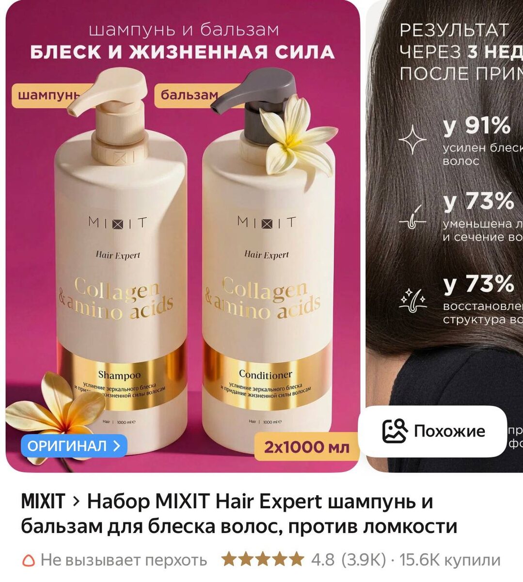 Набор MIXIT Hair Expert шампунь и бальзам для блеска волос, против ломкости https://market.yandex.ru/cc/8L2Kct 🛍DEC122-AF — скидка 100 ₽ на один любой заказ от 5000 ₽ ✅ Канал по скидкам 🔣 Бот с промокодами