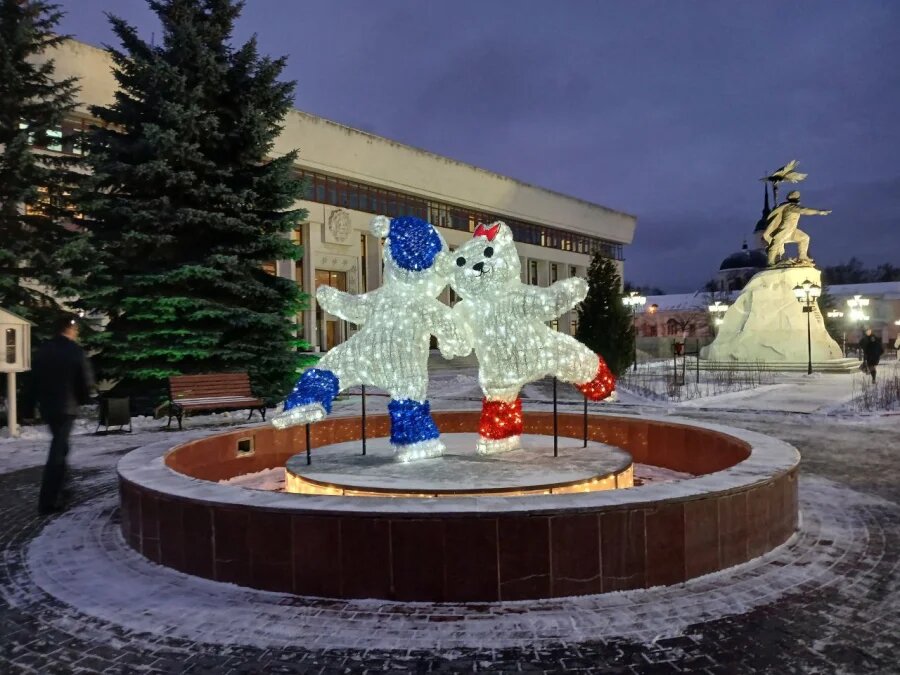 Фигуры появились на площади Старый Торг рядом с катком, который еще готовится к открытию. Два медведя на коньках заняли место светового фонтана. На втором фонтане у здания областной администрации установлен большой конек. По состоянию на утро 23 декабря он не горел. На Старом Торге также установлена одна из трех больших калужских ёлок.