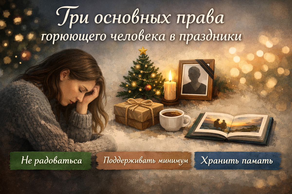 Впереди Новый год. Это один из тех праздников, которые существуют почти повсеместно. У него особая атмосфера. Над ней можно иронизировать, говорить, что это всего лишь огоньки и мишура, но факт остаётся фактом: новогоднее и рождественское время создаёт ощущение общего фона, общего движения. От этого невозможно полностью спрятаться. Неважно, живёте вы в городе или в небольшом населённом пункте — это время всё равно будет рядом. Поэтому наша задача не в том, чтобы исчезнуть, а в том, чтобы найти способ взаимодействовать с этим временем. У человека в горевании есть права, о которых стоит помнить, чтобы пройти новогоднее время с само-заботой.