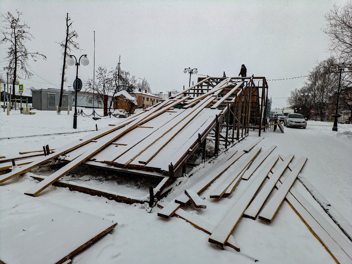 На улице Советской в городе Мамадыш началась подготовка к празднованию Нового года. Рабочие приступили к возведению зимней горки, а также к созданию новогодних снежных фигур.