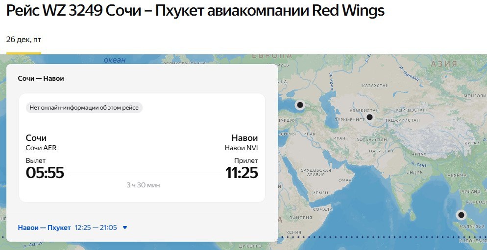 Рейс авиакомпании Red Wings на Пхукет из Сочи 26 декабря, судя по информации Яндекс.Расписание, отправится с промежуточной посадкой в Навои