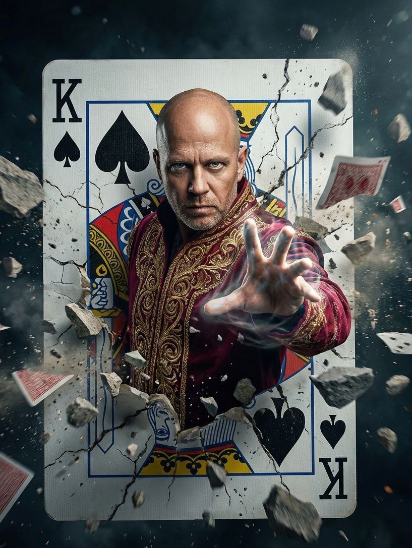 Гиперреалистичный кинематографический постер могущественного колдуна-мужчины, прорывающего треснутую игральную карту Короля Фрагменты камня