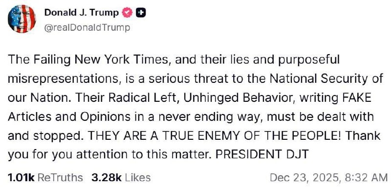 🗞️Президент США Дональд Трамп назвал газету New York Times угрозой национальной безопасности