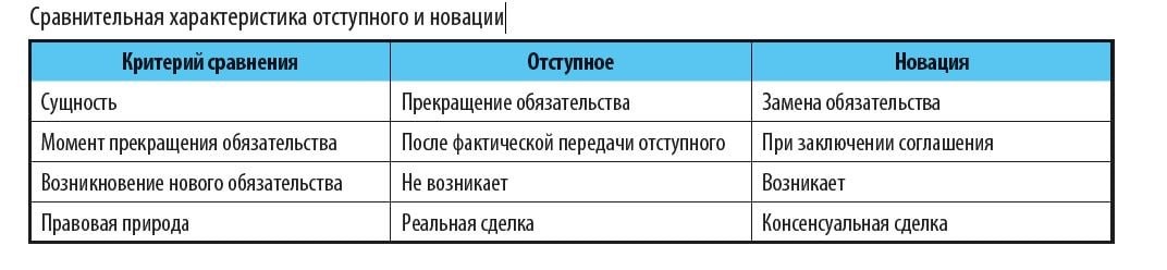 ? Основным отличием новации от отступного являются то, что при новации происходит замена первоначального обязательства на новое, а в случае предоставления отступного оно прекращается без возникновения нового. При отступном имеющийся долг погашается, а при новации — просто изменяет свою форму. Их сравнительная характеристика представлена в таблице.