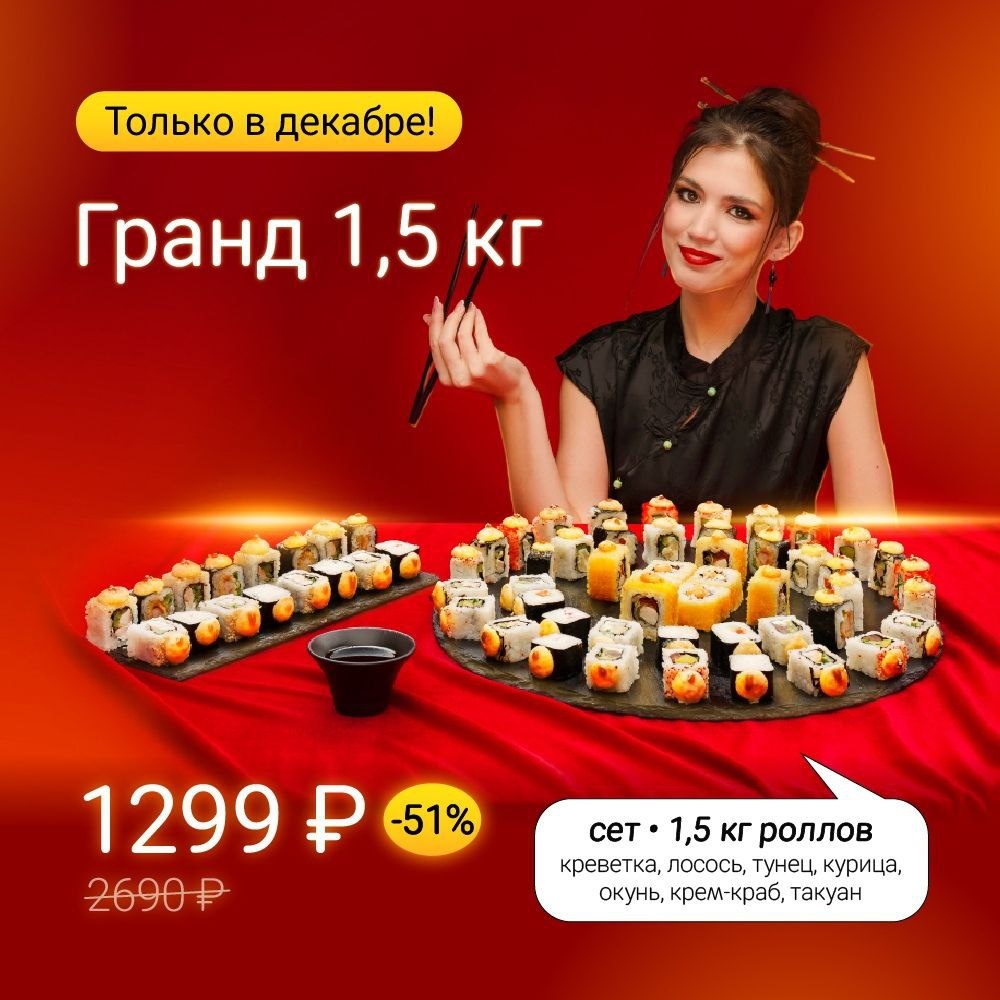 ! И один из главных участников — Гранд 1,5 кг Он легко заменит всю мороку с ужином: 64 аппетитных кусочка с лососем, тунцом, креветкой, окунем, курицей, крем-крабом и такуаном И всё это по праздничной цене — 1299 ₽ ✨ Настоящее гастро-представление, которое хочется повторить! Выбирайте своего фаворита и наслаждайтесь 💛 Оформить заказ 👉 sushifuji.ru/kdr/#action_8929 📱 8 (812) 213-01-23 Предзаказ к Новому году уже доступен!