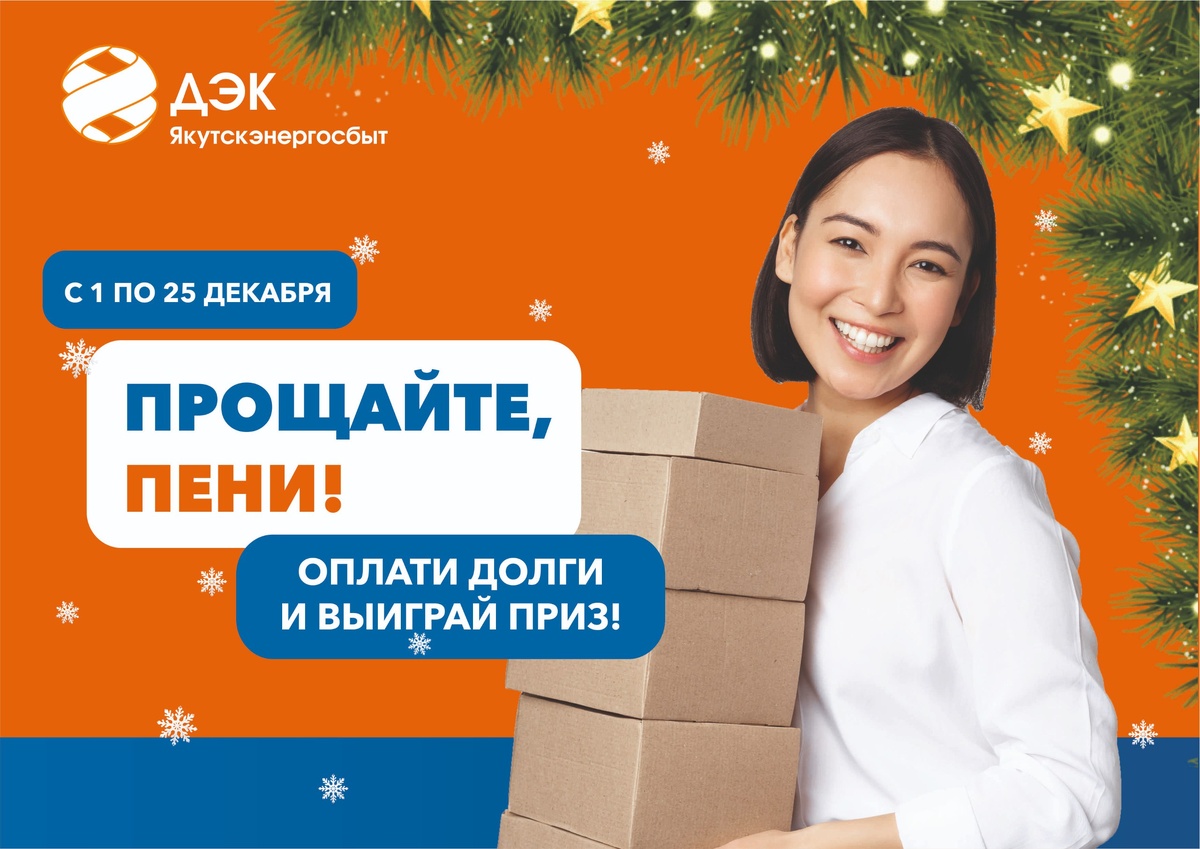 !»❗ ✅ Успейте оплатить коммунальные услуги с выгодой! 2️⃣5️⃣ декабря завершается срок действия акции по списанию пени клиентам «Якутскэнергосбыта». В акции могут принять участие как частные, так и корпоративные клиенты компании. Напоминаем, для участия в акции частным клиентам необходимо: 🟡 полностью погасить задолженность за электро- и тепловую энергию, горячее водоснабжение; 🟡 произвести оплату начислений ноября. ✅ Кроме того, лицевые счета таких клиентов примут участие в розыгрыше подарков при условии: 🟡 подписки на электронную квитанцию; 🟡 регистрации в Личном кабинете ДЭК. ⚡ Розыгрыш четырнадцати сертификатов на бытовую технику состоится в январе 2026 года. ✅ Для корпоративных клиентов и ИКУ условия участия следующие: 🟡 погашение задолженности за электро- и тепловую энергию, также ГВС; 🟡 оплата счетов за ноябрь 2025; 🟡 регистрация в Личном кабинете ДЭК с подписанием допсоглашения к договору (кроме УК и ТСЖ). Всем потребителям, выполнившим условия акции, бу