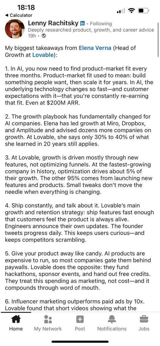 Наткнулась в LI пост от Ленни, который он написал после общения с Elena Verna. Она сейчас отвечает за growth в Lovable. Очень срезонировало, потому что я думала о похожем сама в контексте роста своих продуктов и участия Европы в технологической гонке. TL;DR: нужно двигаться быстро за счет внедрения новых фич, но при этом держать качество. Постоянно говорить о продукте, расти за счет коммьюнити и инфлюенсеров. 1. В AI product–market fit нужно находить заново каждые ~3 месяца, даже при $200M ARR. 2. Старые growth-плейбуки больше не работают: применимо лишь 30–40% прошлого опыта. 3. Рост в AI идёт на 95% от новых фич и продуктов, а не от оптимизации воронок. 4. Постоянно релизь и публично об этом говори, продукт должен «жить» на глазах у пользователей. 5. Раздавай продукт щедро: бесплатные кредиты и ивенты - это маркетинг, а не издержки. 6. Инфлюенсеры и короткие видео работают в ~10 раз лучше платной рекламы. 7. MVP умер: минимальный стандарт теперь - «минимально любимый продук
