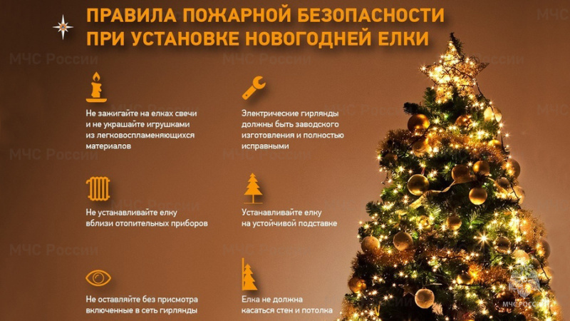 С наступлением новогодних праздников многие семьи и организации устанавливают новогодние ёлки. Чтобы праздничное оформление не стало причиной пожара и угрозы жизни людей, Главное управление МЧС России по Тверской области напоминает о строгом соблюдении правил пожарной безопасности при установке и эксплуатации новогодней ёлки как в жилых помещениях, так и в общественных местах. 1. Ёлка должна устанавливаться на устойчивой, прочной подставке, исключающей её падение. 2. Ветви ёлки должны находиться на расстоянии не менее 1 метра от стен, потолка и нагревательных приборов (печей, радиаторов, электронагревателей). 3. Не допускается размещение ёлки вблизи путей эвакуации, у дверей выходов, в проходах — это может препятствовать быстрой эвакуации при пожаре. 4. Для украшения ёлки следует использовать исправные электрические гирлянды заводского изготовления, имеющие сертификат пожарной безопасности. При использовании гирлянд не допускается: эксплуатация с повреждённой изоляцией проводов; перегр