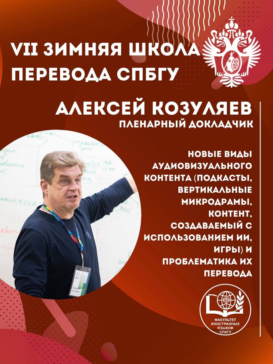 Коллеги, приглашаем вас на Зимнюю школу перевода СПбГУ! 23 января 2026 года Алексей Козуляев — глава компании «РуФилмс», кандидат педагогических наук, один из ведущих экспертов в области аудиовизуального перевода. Под его руководством переведено более 15 000 часов контента для Netflix, Amazon Prime, NBCUniversal, FoxTV и других мировых лидеров индустрии. Тема выступления: «Новые виды аудиовизуального контента (подкасты, вертикальные микродрамы, контент, создаваемый с использованием ИИ, игры) и проблематика их перевода» Ждем вас на Зимней школе перевода СПбГУ! Регистрация: https://events.spbu.ru/winter-translate-2026