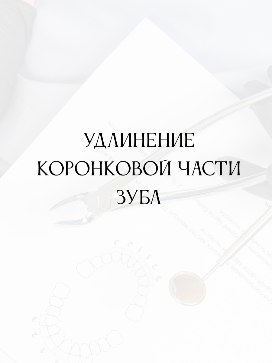 Коронковая часть зуба - это та часть, которую мы видим над уровнем десны. Иногда её высоты недостаточно для качественного восстановления зуба пломбой или коронкой. В таких случаях проводится удлинение коронковой части - хирургическое перемещение края десны вниз, чтобы открыть доступ к здоровым тканям зуба.