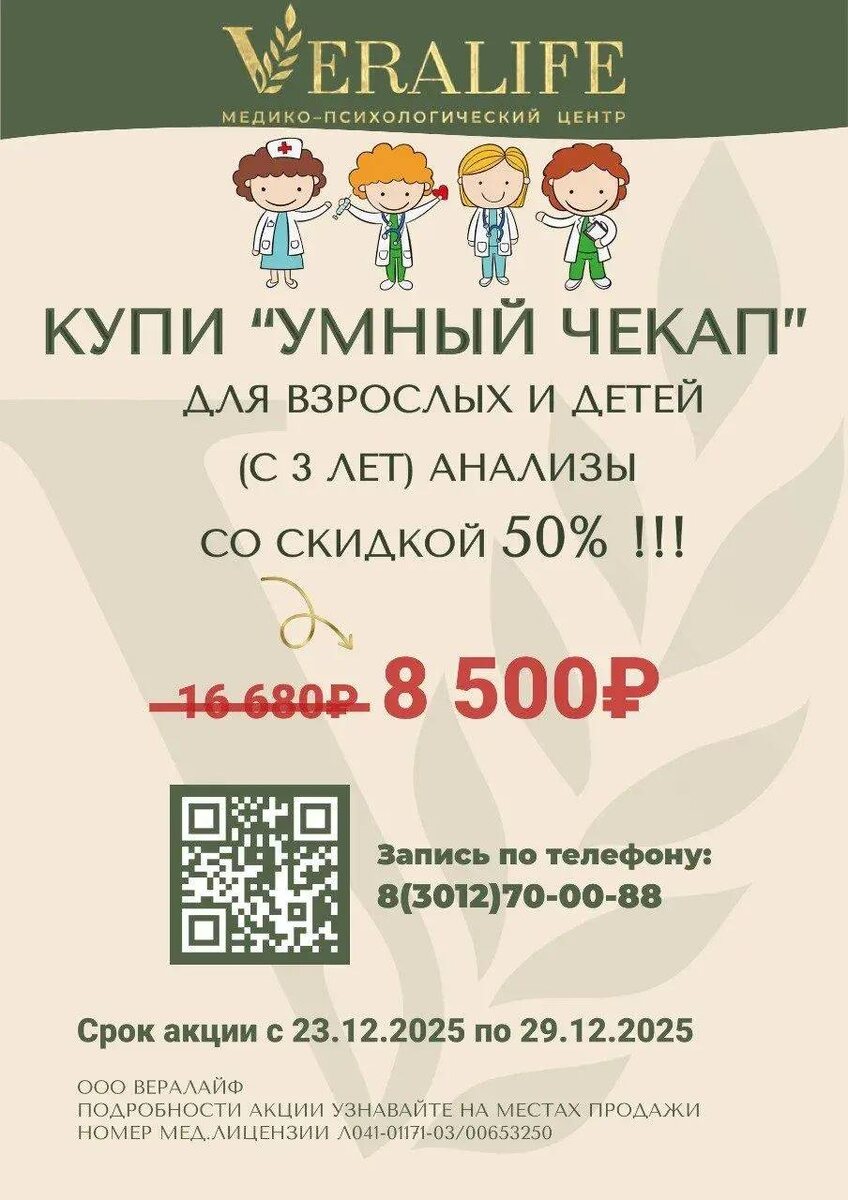 ? Усталость, тревожность, выпадение волос, частые простуды — всё это часто не случайность, а сигналы скрытых дефицитов и нарушений обмена веществ. «Умный чекап» — это комплексное обследование, которое позволяет выявить истинные причины недомоганий и получить персональные рекомендации от врача. Стоимость: 16 680₽ 8 500₽. Выгода: более 8 000 руб. по сравнению с отдельными анализами. Время сдачи: ежедневно, с 9:00 до 12:00. Возможен выезд в организации — забор анализов прямо на рабочем месте, с последующей онлайн- или офлайн-интерпретацией. Что входит: Ферритин, витамин D, B12, магний, фолаты, гомоцистеин, инсулин, железо, минералы — диагностика скрытых дефицитов, усталости, выгорания. Гормоны щитовидной железы (ТТГ, Т3, Т4, антитела) — энергия, вес, настроение, тревожность. ОАК, ОАМ, биохимия крови, липидный профиль — воспаление, анемия, работа печени и почек, уровень глюкозы и холестерина. Копрограмма — качество пищеварения и работа ЖКТ. Кому подойдёт: тем, кто сталкивается с