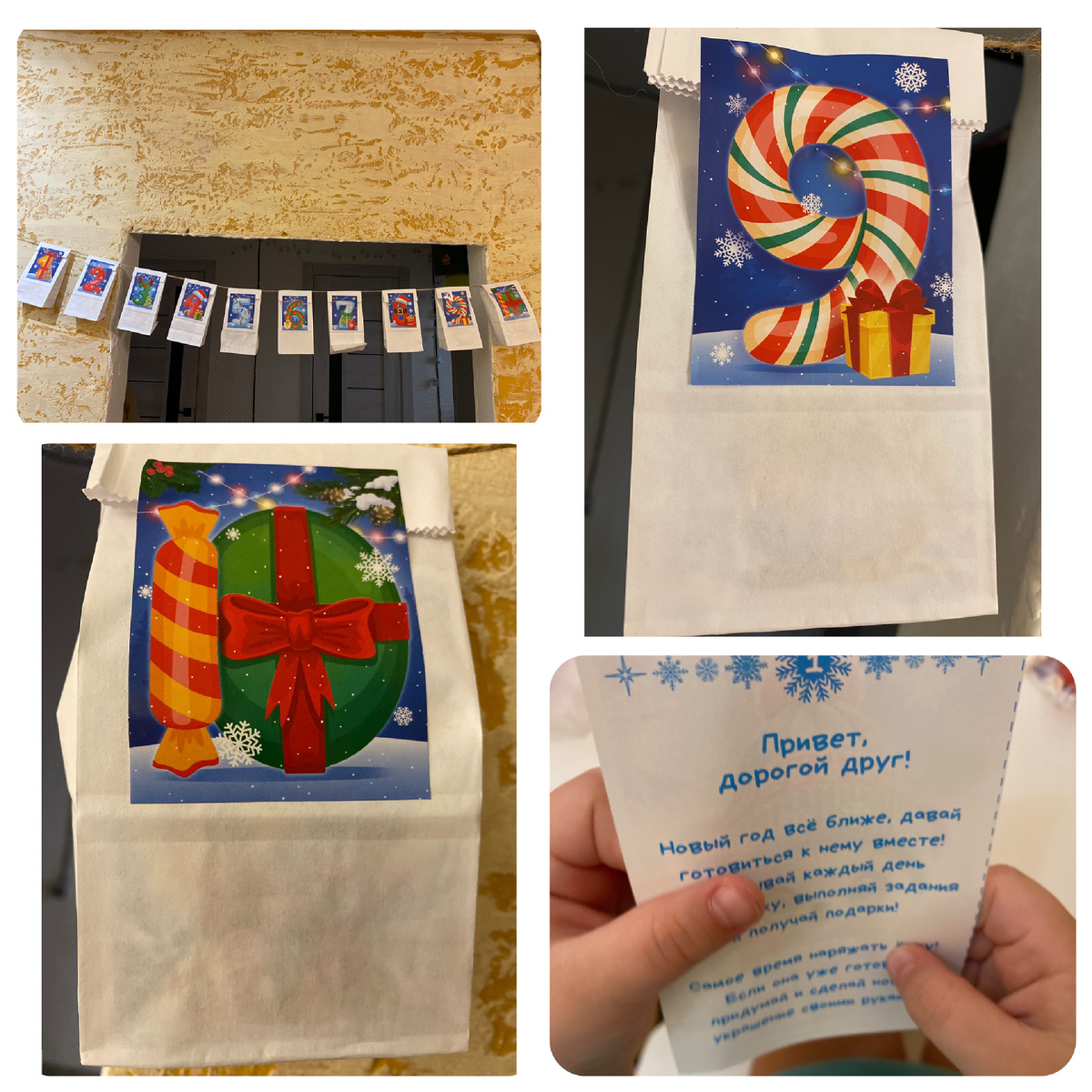 я не проявила креативность в этой подготовке, а купила готовые пакетики с наклейками и открытками с заданиями. Небольшие подарки вложила внутрь, остальные Дед Мороз оставляет у балконной двери после выполненного от него поручения.