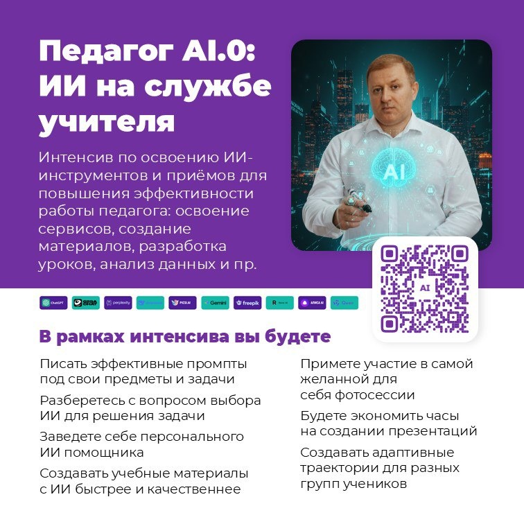 В рамках интенсива вы научитесь: - Писать эффективные промпты под свои предметы и задачи. - Разберетесь с вопросом выбора ИИ для решения задачи. - Заведете себе персонального ИИ помощника. - Создавать учебные материалы с ИИ быстрее и качественнее. - Примете участие в самой желанной для себя фотосессии. - Будете экономить часы на создании презентаций. - Создавать адаптивные траектории для разных групп учеников. Подробная информация на сайте интенсива «Педагог AI.0: ИИ на службе учителя» - 🔗 https://dibirov-md.ru/lpages/intensiv-pedagog-ai-0
