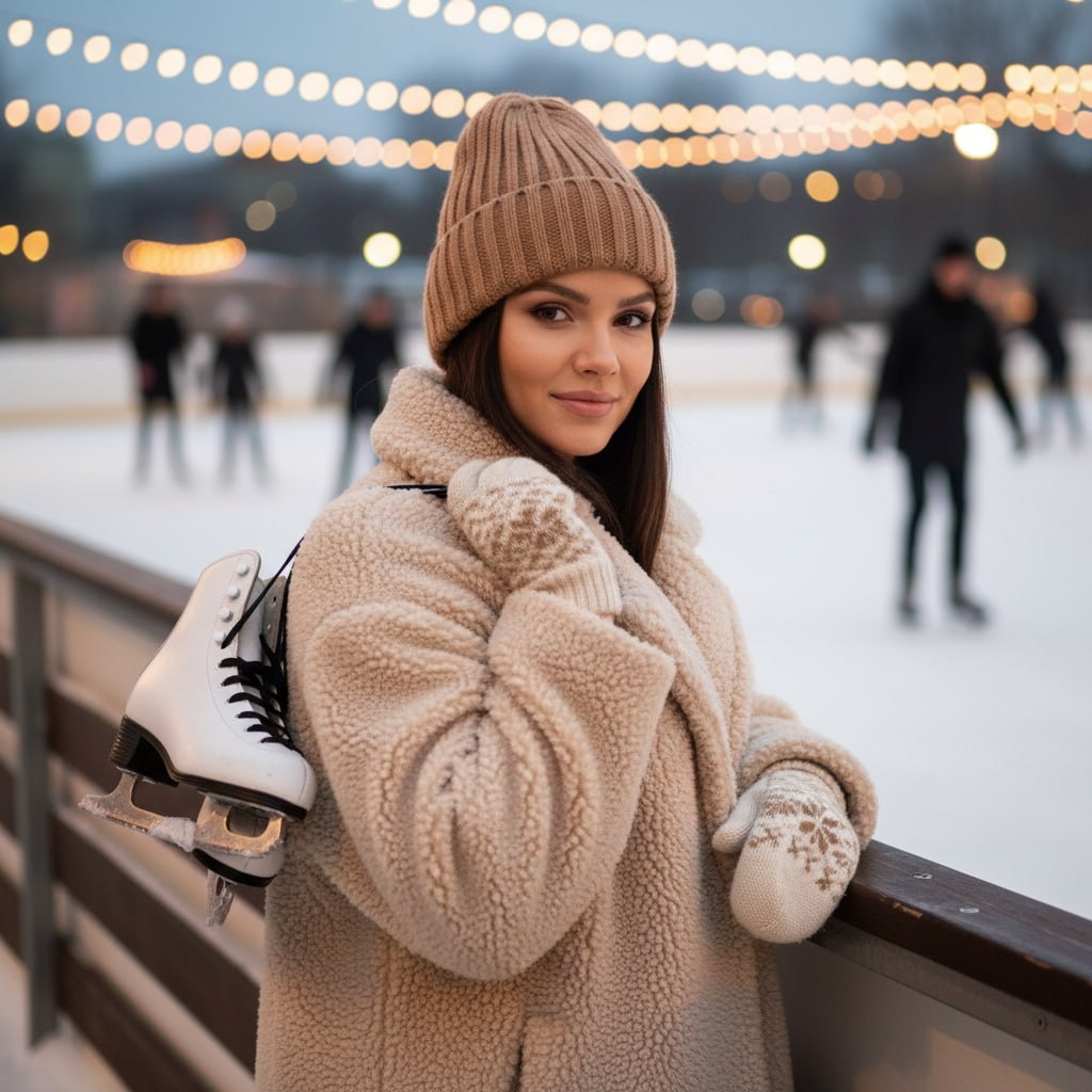 Хватит ждать снега ради пары нормальных кадров. Этот промпт закидывает тебя (или твою модель) прямиком в эстетику дорогого зимнего катка. 🌚 Главная фишка — выкрученное на максимум сходство. ИИ сохраняет черты лица на 100%, добавляя мягкий свет, текстурную одежду и тот самый киношный боке от гирлянд. Выглядит как профессиональная съемка, а не просто картинка из нейронки. 🗿 Используя загруженное селфи в качестве точной копии лица (face fidelity 1.0), создайте портрет женщины в середине кадра на зимнем катке. Она смотрит в сторону с мягкой улыбкой, перекинув через плечо белые фигурные коньки (на черных шнурках). Наряд: плюшевое пальто-тедди кремового или серовато-белого цвета (искусственный мех/текстура шерпа), светло-коричневая вязаная шапочка в рубчик, белые вязаные варежки с рисунком. Рядом с ней: деревянные/металлические перила катка. Слегка размытый фон (малая глубина) — другие фигуристы, праздничное теплое боке (желтые/оранжевые гирлянды). Сумеречное/вечернее освещение, уютное и р