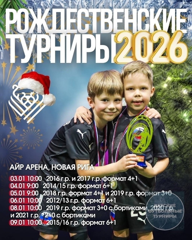 АЙР АРЕНА, НОВАЯ РИГА Да, 2025-й ещё не закончился… а МИНЬКА.РФ уже на шаг впереди! Планируем будущее, пока другие доигрывают настоящее БРОНИРОВАНИЕ: +7 903 146-90-18 Расписание турниров: 03.01 | 10:00 2016 г.р. и 2017 г.р. — формат 4+1 04.01 | 09:00 2014/2015 г.р. — формат 6+1 05.01 | 09:00 2018 г.р. — формат 4+1 2019 г.р. — формат 3+0 06.01 | 10:00 2012/2013 г.р. — формат 6+1 08.01 | 10:00 2019 г.р. — формат 3+0 с бортиками 2020 г.р. и 2021 г.р. — формат 2+0 с бортиками 09.01 | 10:00 2015/2016 г.р. — формат 6+1 МИНЬКА.РФ — играем сегодня, готовимся к завтра Новый год начинается с футбола Каникулы, которые запомнятся До встречи на АЙР АРЕНЕ! --- #ФутбольныйТурнирЯнварь2026 #ФутбольныйТурнирМосква2026 #ФутбольныйТурнирМосква2012гр #ФутбольныйТурнирМосква2013гр #ФутбольныйТурнирМосква2014гр #ФутбольныйТурнирМосква2015гр #ФутбольныйТурнирМосква2016гр #ФутбольныйТурнирМосква2017гр #ФутбольныйТурнирМосква2018гр #ФутбольныйТурнирМосква2019гр #ФутбольныйТурнирМосква2020гр #Футбол