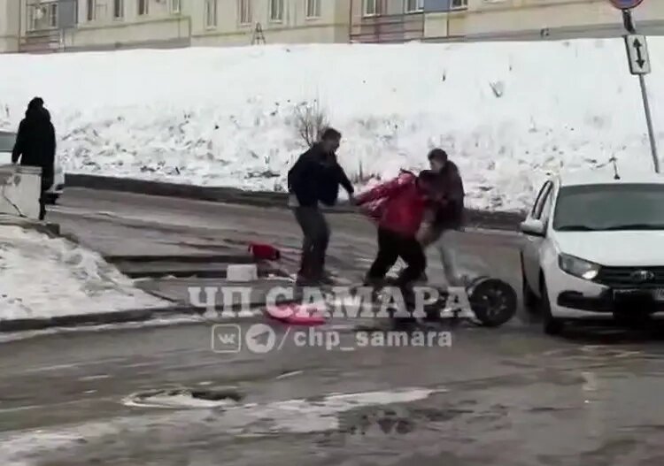 Конфликт между курьером сервиса доставки и двумя мужчинами в Самаре очевидцы сняли на видео и выложили в сеть. По словам курьера, двое молодых людей на автомобиле догнали его после фразы «зачем вы бибикаете» и распылили ему в лицо перцовый баллончик, сообщают телеграм-каналы. На кадрах видно, как к месту конфликта подбегают другие доставщики, которые пытаются заступиться за коллегу. После этого молодые люди, применившие баллончик, спешно садятся в автомобиль и уезжают. Как сообщили «Самарской газете» в ГУ МВД России по Самарской области, обстоятельства произошедшего устанавливаются. Ранее самарцы заметили крысу в кофейне фудхолла и сняли ее на видео. Фото: скриншот с видео телеграм-канала «ЧП Самара»