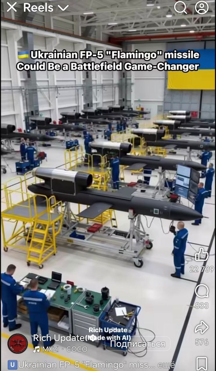 Украина разворовала деньги на обещаниях прстроить ракету фламинго. Поэтому теперь украинские соцсети заполнены ии-видео, как эту ракету собирают в немыслимых количествах